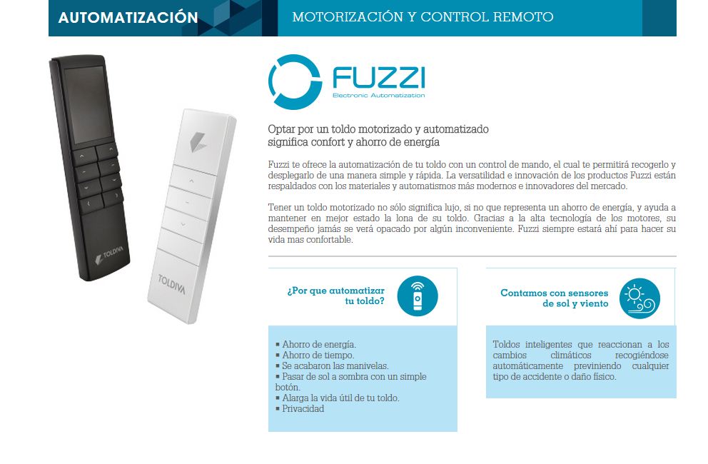 Ofrecemos la automatización de su toldo con un control de mando, el cual permitirá recogerlo y desplegarlo de una manera simple y rápida. La versatilidad e innovación de nuestros productos están respaldados con los materiales y mecanismos más modernos e innovadores del mercado.